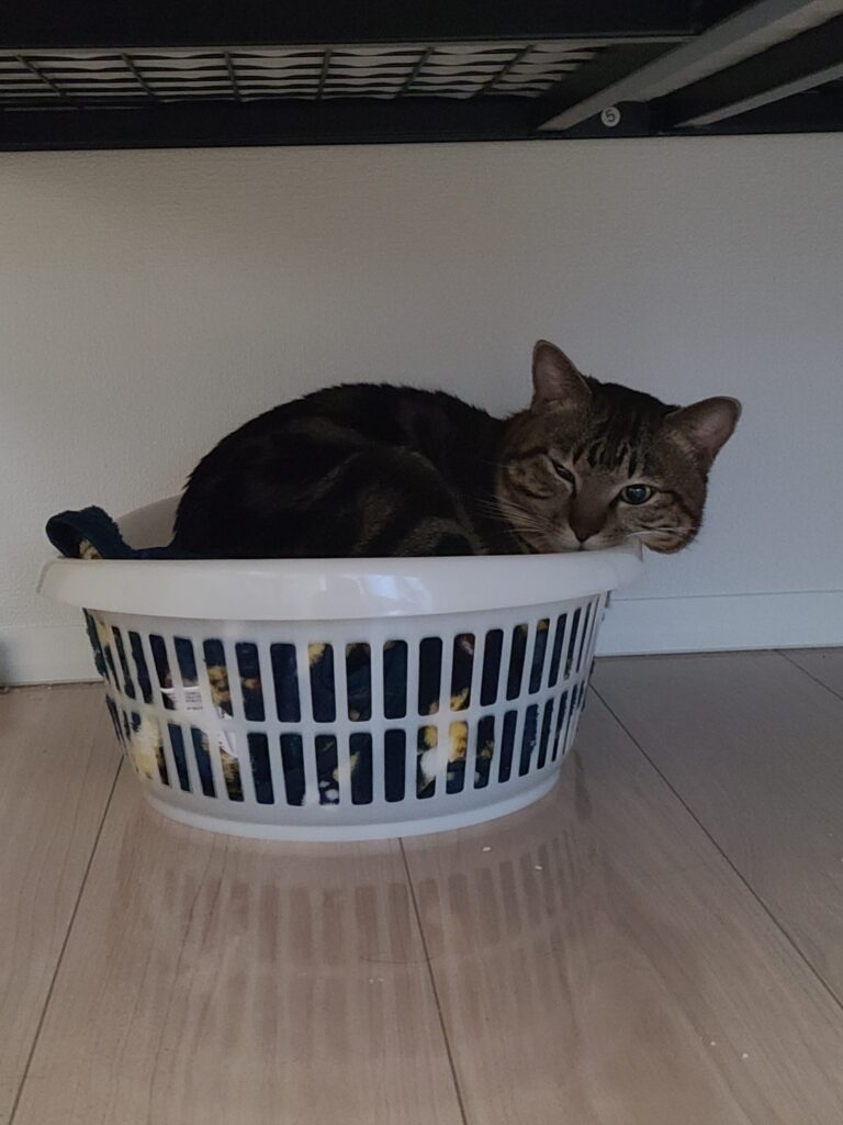 ずっと床に落ちてるから冷たかろうと余ってたダイソーの籠にキャリーに入っていた兄の服を詰めて一晩、ほっぺが落ちるような猫が完成。肉ではなく冬毛。
